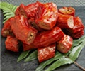 延辺スンデ 豚の腸にもち米や春雨、香味野菜などを詰めて茹でたり蒸したりしたものです。 スンデは見た目が特徴的で、赤黒い色をしていることが多く、屋台でよく見かけます。 |